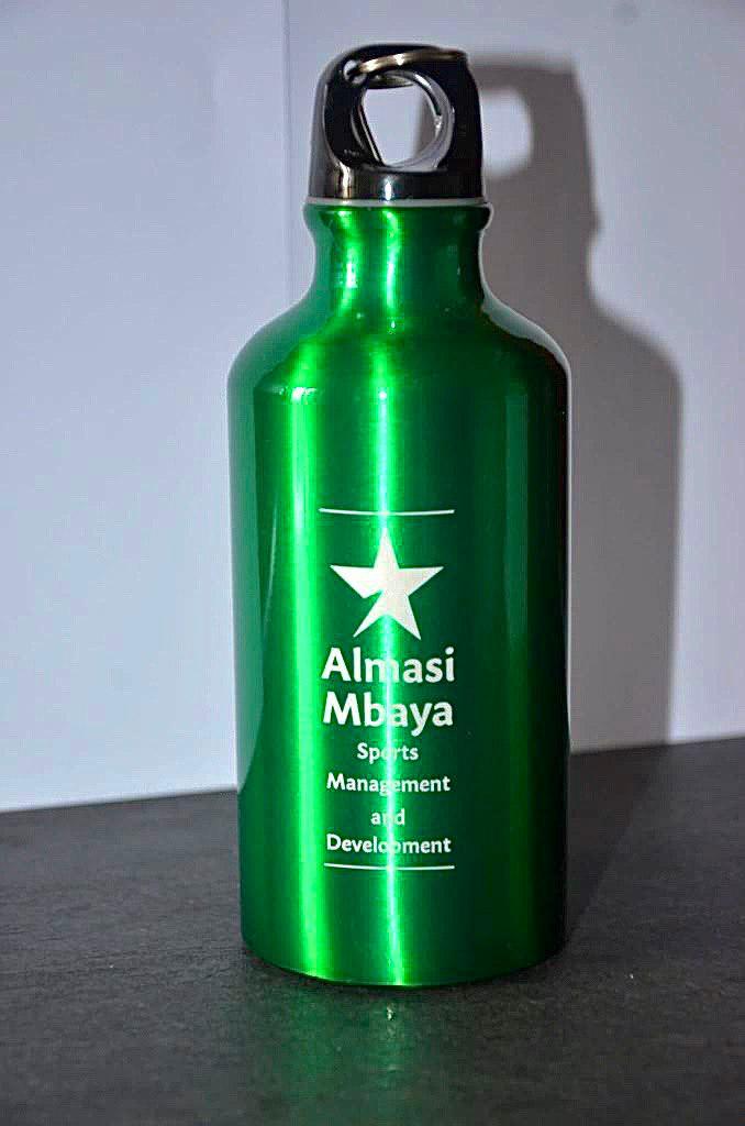 Sportsman’s Bidon in green, with Almasi Mbaya Sports Management and Development logo, with a capacity of 400 ml, made of aluminum, with dimensions of 65 x 170 mm.